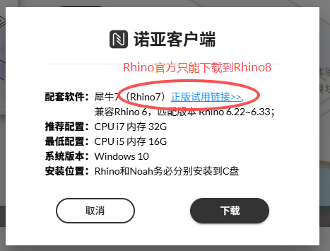 E3是独立的平台,若不需要调用Rhino功能是可以不用安装Rhino的,NOAH客户端是要求必须安装Rhino7的。