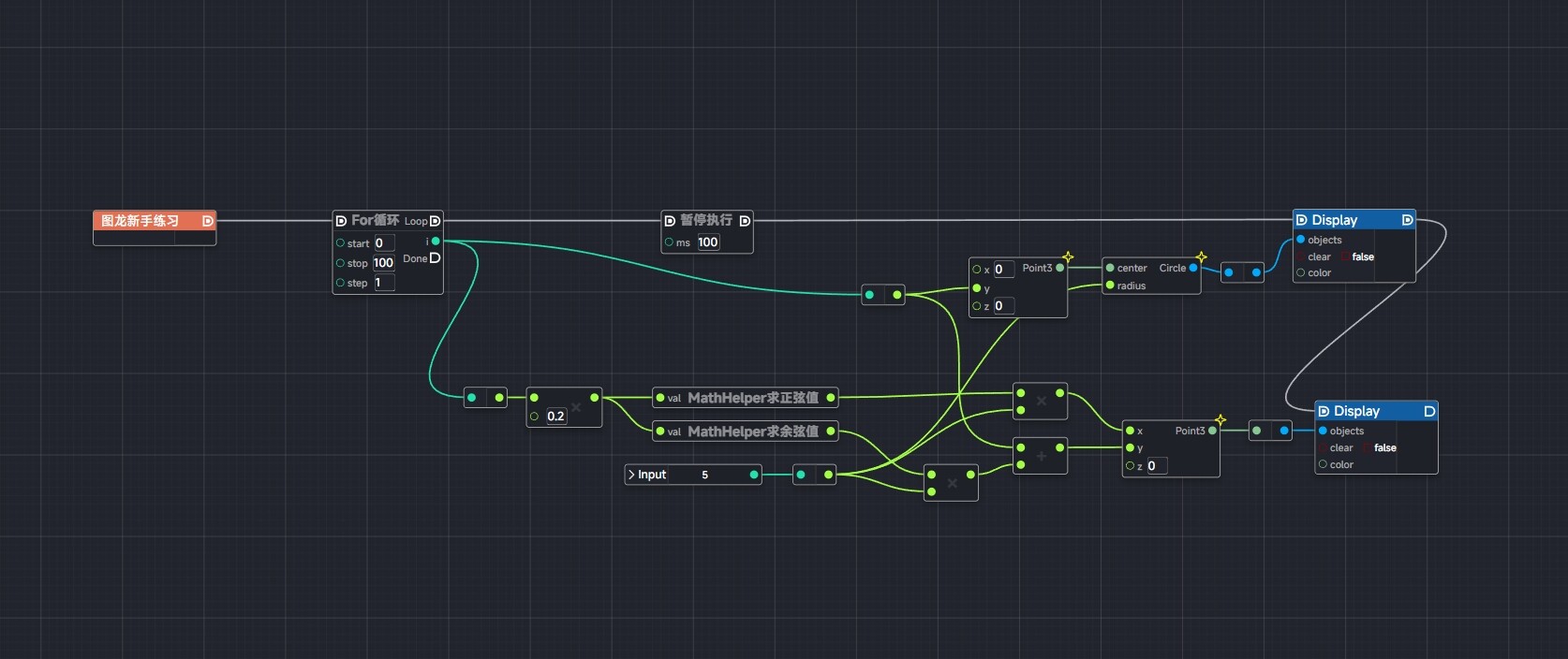 程序从“图龙新手练习”模块触发起始信号,通过“For 循环”模块设定从0到100、步长为1的循环迭代过程。在每次循环中,利用“MathHelper求正弦值”和“MathHelper求余弦值”模块对循环计数等数值进行数学运算,再结合乘法模块进一步处理数值。通过这些运算结果,使用“Point3”模块创建三维点坐标,进而确定“Circle”模块所定义圆的中心点位置及相关参数。循环过程中,通过“暂停执行”模块控制每轮迭代的时间间隔为100毫秒,最后利用“Display”模块将创建的圆等对象进行可视化展示。
