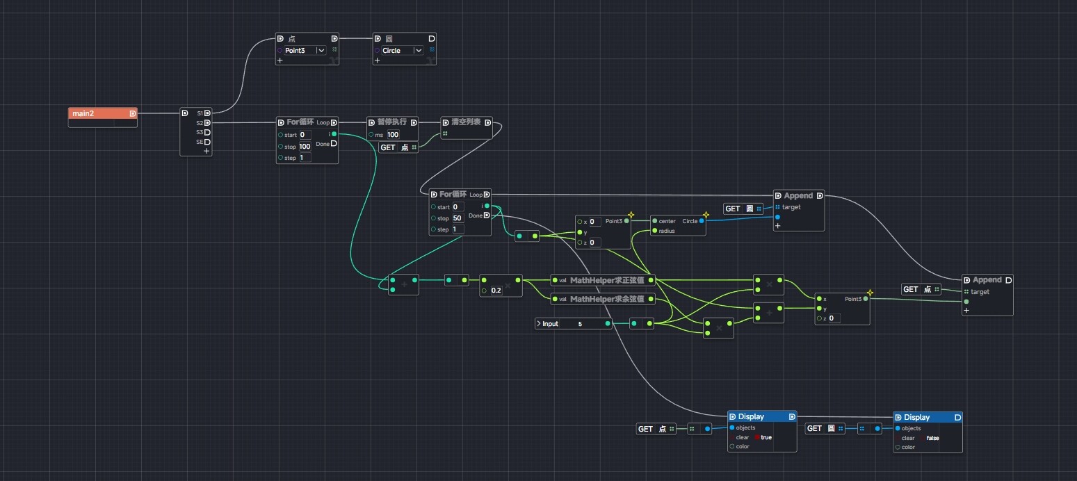 从 main2 模块启动流程,核心靠双重循环驱动动态动画:外层 For 循环作为 “帧控制器”,每轮迭代对应动画一 “帧”,迭代时先通过 “清空列表” 模块删掉上一帧数据,保证画面不叠加;内层 For 循环在每帧内运行,利用数学运算、点创建等模块生成该帧所需图形元素(如点、圆 )。