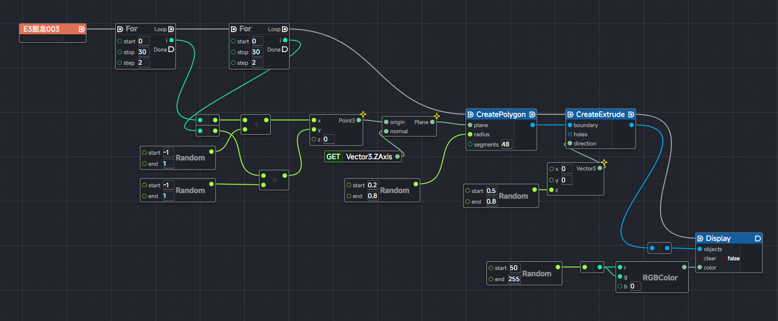 程序从 “E3 图龙 003” 模块开始,通过双重循环(For Loop)控制生成圆柱体的数量和布局。在循环内部,利用多个Random模块生成随机数,来确定圆柱体在平面上的位置(X、Y 坐标)、高度(Z 坐标)、半径以及颜色。接着,依据这些随机参数,通过Point3模块创建三维点,结合GET Vector3.ZAxis获取的 Z 轴向量,利用Plane模块创建平面,再使用CreatePolygon模块在平面上创建多边形(近似圆形底面),随后通过CreateExtrude模块将多边形拉伸成圆柱体。最后,利用RGBColor模块生成随机颜色,由Display模块将所有生成的圆柱体进行可视化展示。